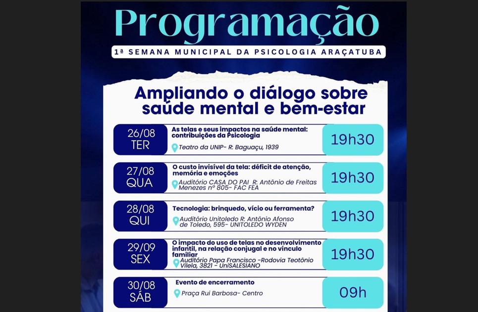 A Prefeitura de Araçatuba (SP) comemora a partir deste domingo (24), a 1ª Semana Municipal da Psicologia. O evento passou a entrar no calendário municipal com a aprovação do projeto do vereador Rodrigo Atayde (PRTB), em maio deste ano, instituindo o Dia Municipal de Psicólogo, a ser comemorado, anualmente, em 27 de agosto.