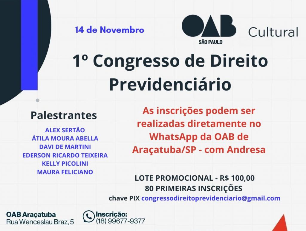 Araçatuba (SP) receberá o 1º Congresso de Direito Previdenciário, iniciativa inédita da Comissão de Direito Previdenciário da OAB (Ordem dos Advogados do Brasil) Araçatuba, que acontece em 14 de novembro.