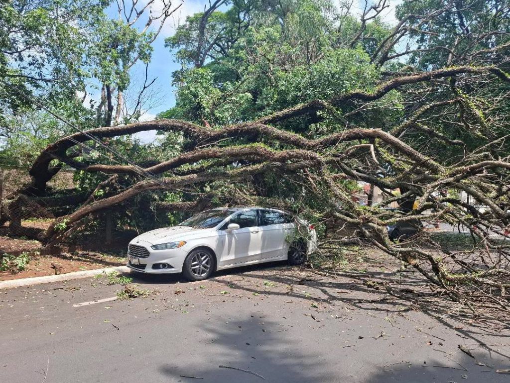 Pelas imagens é possível notar que o tronco e galhos da árvore caíram sobre a cerca da propriedade e também sobre um carro que estava estacionado. Outros dois carros estavam estacionados na avenida, mas aparentemente apenas alguns galhos caiu sobre um deles.