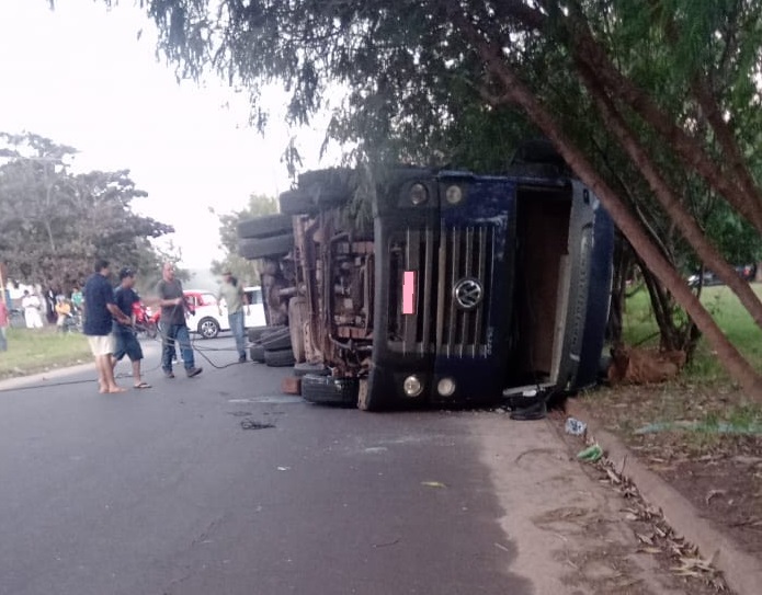 Um caminhão carregado com ração para gado tombou na tarde deste sábado (5), quando o motorista fazia uma curva em uma rua no bairro Vista Verde, em Araçatuba (SP).