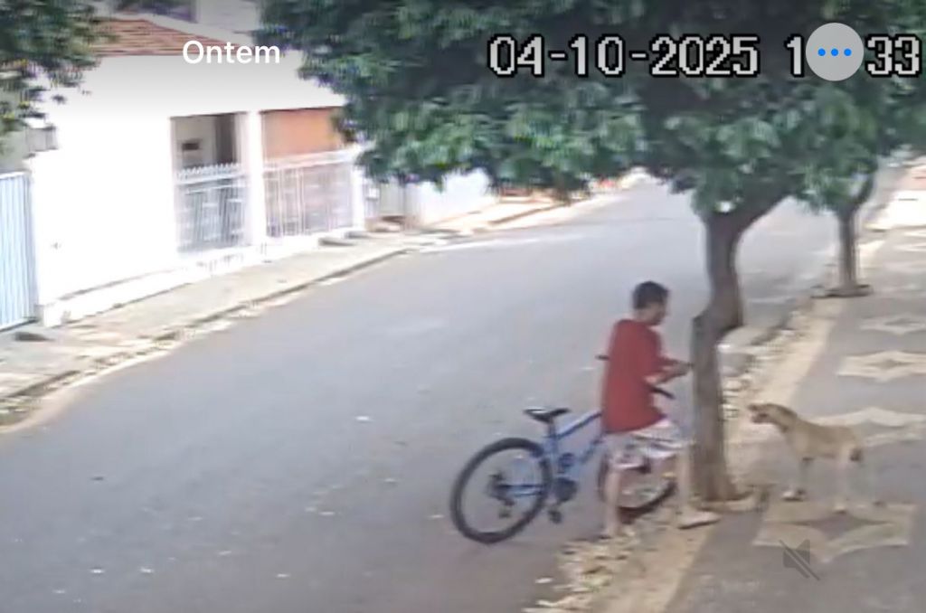 As imagens mostram um homem empurrando uma bicicleta, trazendo o cão preso aparentemente com uma corrente. Ele olha para os lados ao se aproximar da árvore, prende a corrente ao tronco dela e deixa o local rapidamente, pedalando a bicicleta.