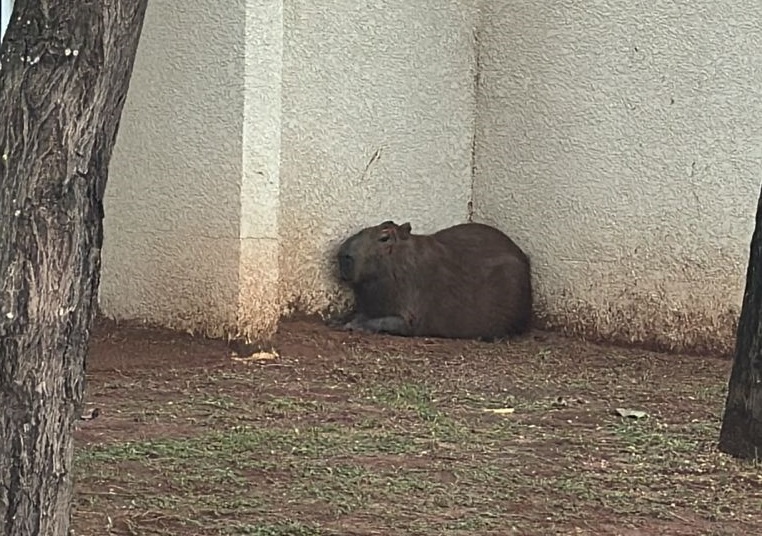 Uma capivara ferida, possivelmente vítima de um atropelamento, se refugiou em um condomínio de casas no bairro Concórdia, em Araçatuba (SP) no início da manhã desta segunda-feira (9).
