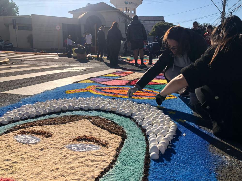 Fiéis das 12 paróquias de Araçatuba participam da confecção do tapete que, conforme a tradição de fé, ornamenta o caminho pelo qual Jesus Eucarístico será conduzido na procissão posterior à Santa Missa.