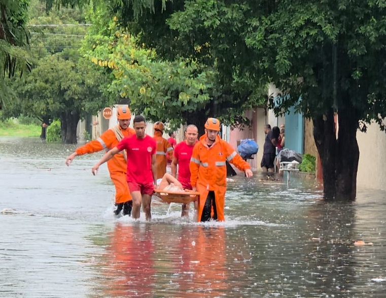 A reportagem esteve no local e acompanhou o resgate de três crianças na rua Naur Antônio dos Santos, onde o nível da água atingiu o peito dos agentes, que antes haviam resgatado três adultos.