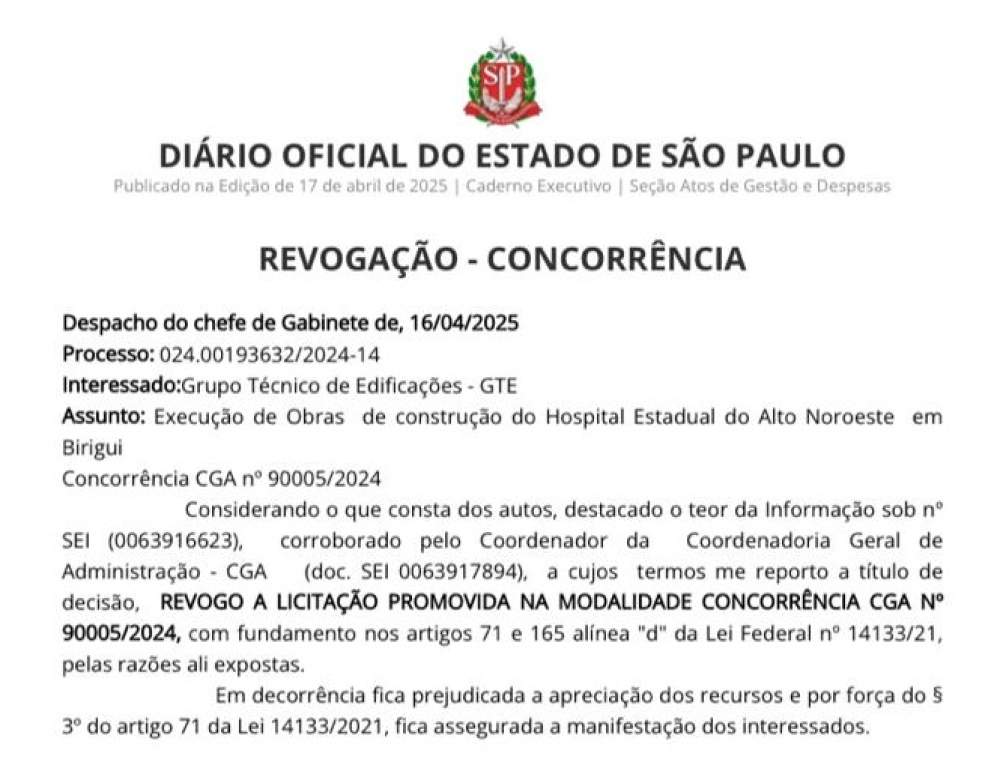 O governo do Estado revogou a licitação do tipo concorrência pública, que tinha como objetivo contratar empresa para a construção do Hospital Estadual Alto Noroeste, em Birigui (SP).