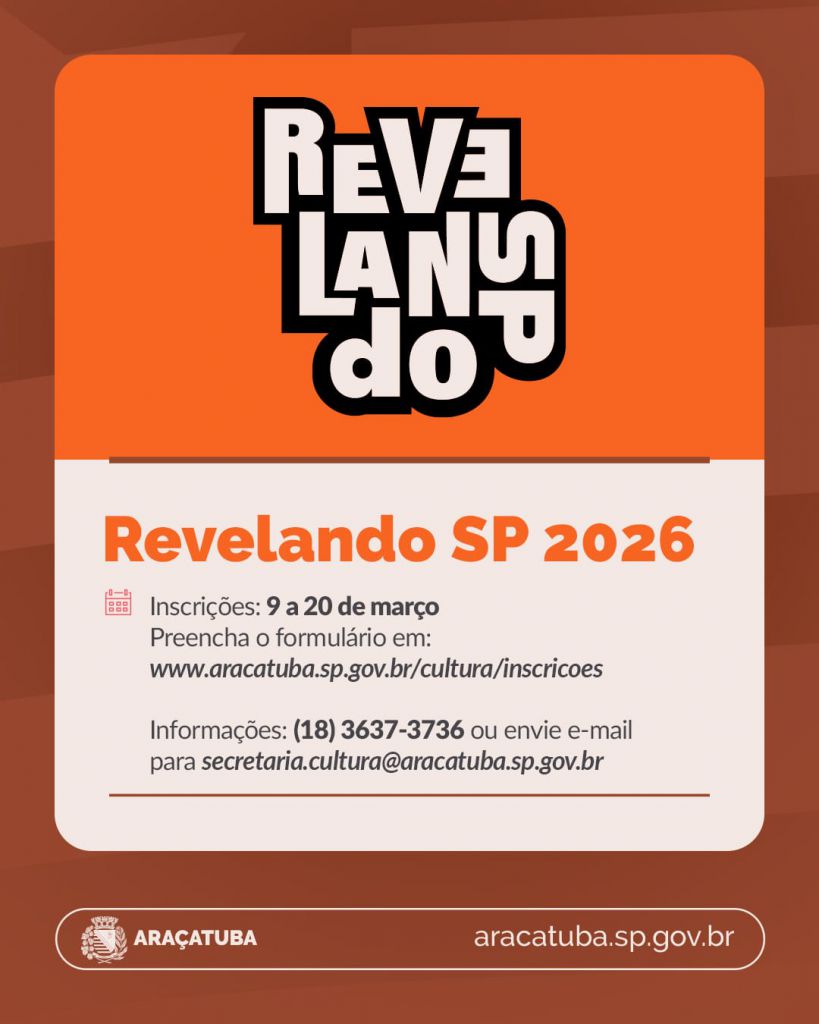 As inscrições para o Revelando SP 2026 já estão abertas. Artistas, artesãos e culinaristas interessados em representar Araçatuba no evento podem se inscrever até o dia 20 de março pelo site da Secretaria Municipal de Cultura.
