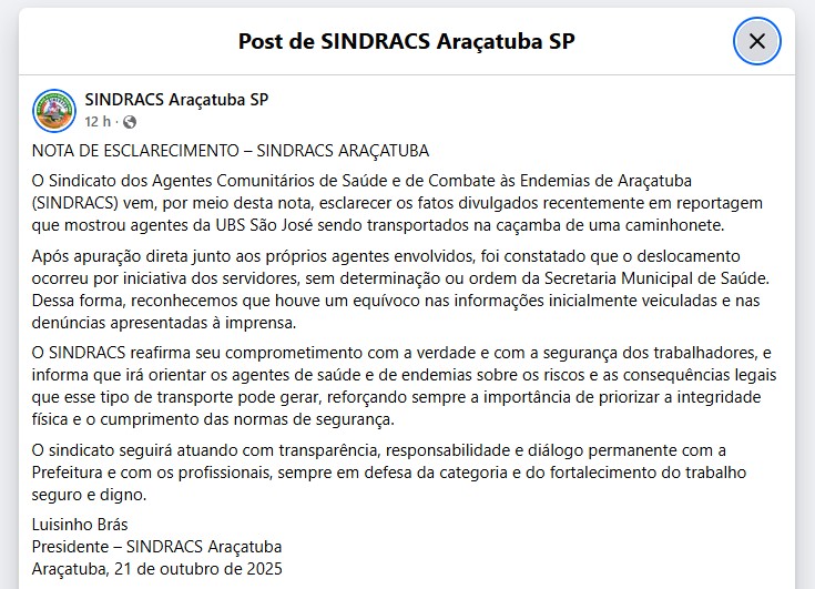 Na nota divulgada à imprensa, a Prefeitura informa que o Sindicato dos Agentes Comunitários de Saúde e de Combate às Endemias de Araçatuba também fez uma publicação, comunicando que os agentes envolvidos afirmaram que teria sido iniciativa deles o deslocamento na caçamba.