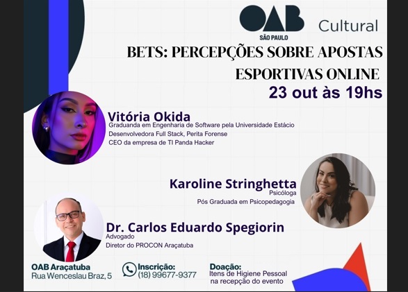 A Subseção da OAB (Ordem dos Advogados do Brasil) promove nesta quarta-feira (23), às 19h, uma palestra com o tema “BETs: Percepções sobre apostas esportivas online”. O evento contará com a participação de três profissionais de diferentes áreas para debater os reflexos causados pelos jogos on line, inclusive na questão psicológica das pessoas.