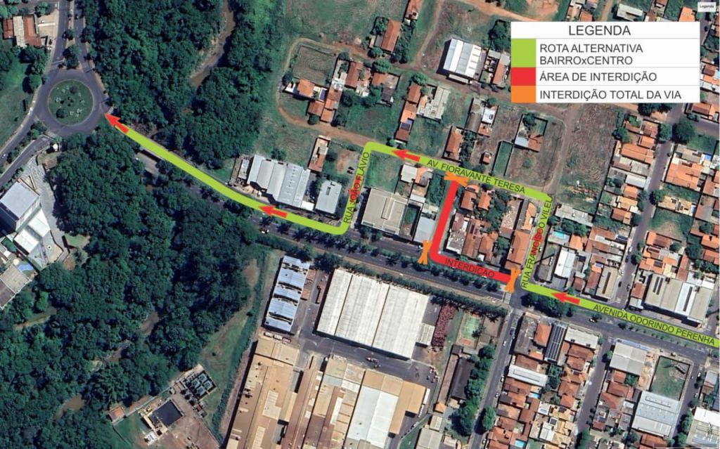Nesse período, os usuários da via que seguem sentido centro deverão seguir pela rua Francisco Vilela, virar à esquerda na avenida Fioravante Teresa e depois à esquerda na rua João Flávio, para retornar para a Odorindo Perenha.