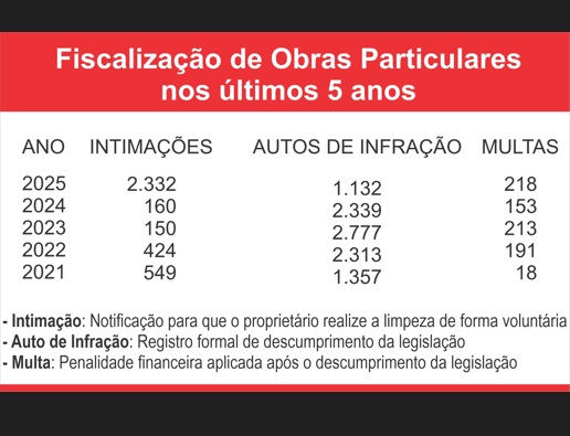 Por outro lado, houve queda na formalização dos autos de infração após o prazo legal de dez dias da intimação, com 1.132 registros em 2025. Em 2024 foram 2.339 autos de infração. Segundo a Prefeitura, isso é reflexo da mudança de estratégia da atual administração municipal, que priorizou a intimação e a regularização voluntária antes da penalização formal.