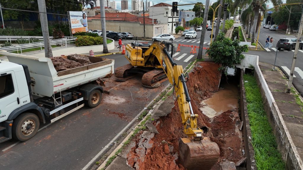 Os trabalhos de desobstrução do canal da Avenida João Arruda Brasil avançaram nesta terça-feira (10), em Araçatuba, após o desmoronamento de parte do muro de contenção provocado pelas fortes chuvas do último fim de semana.