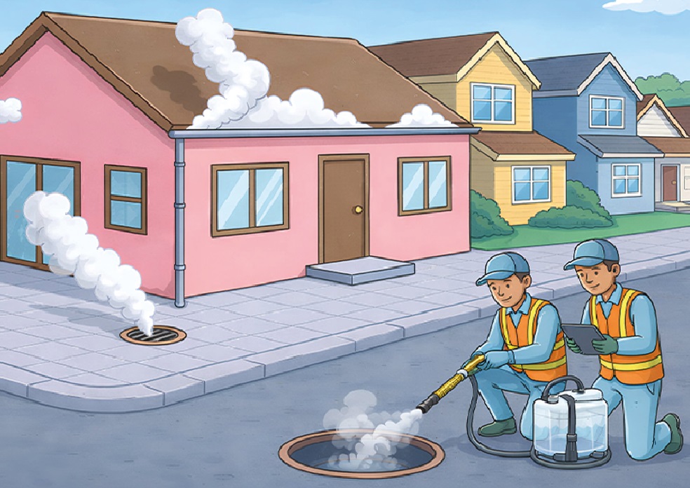 Durante o teste, a fumaça é injetada nos chamados poços de visitas existentes na rua. Em caso de ligações irregulares de água de chuva na rede de esgoto, a fumaça pode aparecer nas calhas dos telhados das casas.