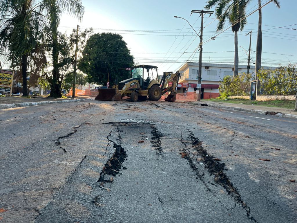 O trânsito no local está interditado para reconstrução do asfalto que afundou com chuvas de segunda-feira (13), no local onde foi feita a instalação de uma nova rede coletora de esgoto.