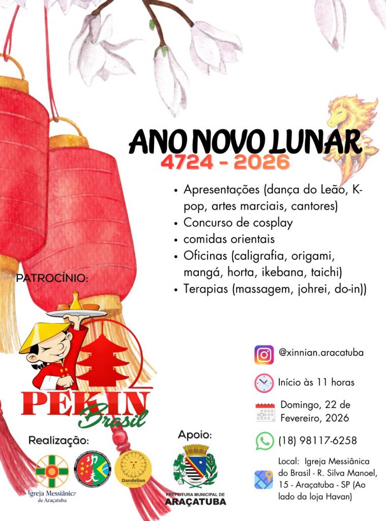 Araçatuba se prepara para uma imersão na cultura oriental com a celebração do Ano Novo Lunar, que será realizado no dia 22 de fevereiro, a partir das 11h. A programação acontece na Igreja Messiânica do Brasil, localizada na Rua Silva Manoel, 15, ao lado da loja Havan, e será aberta ao público. Para participar, basta contribuir com a doação de 1 litro de leite ou 1 quilo de alimento não perecível, que serão destinados a ações solidárias.