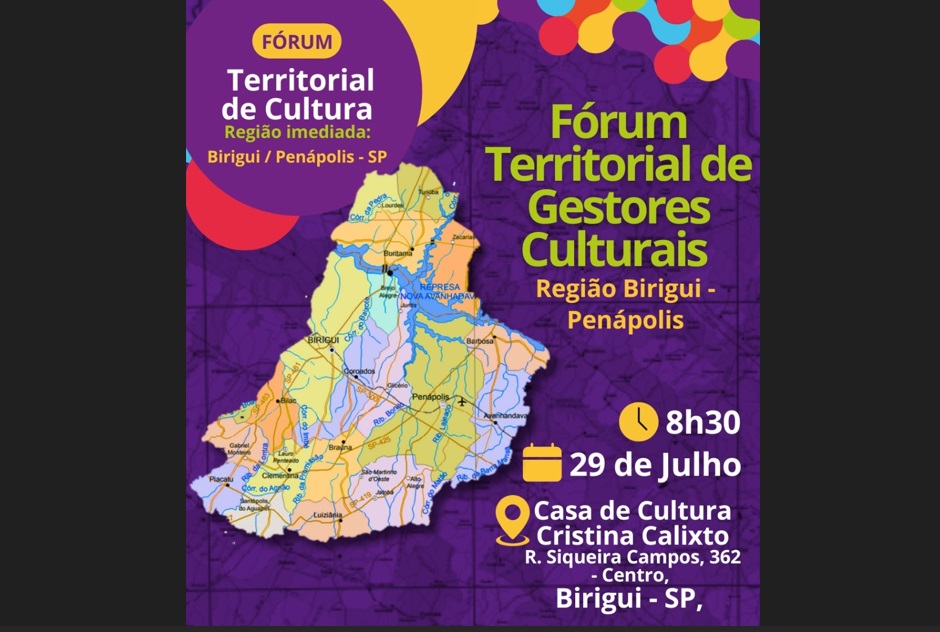 O Fórum Regional de Cultura da Região Imediata de Birigui (SP) será realizado nesta terça-feira (29), das 9h às 17h, na Casa de Cultura Cristina Calixto, com a participação de representantes de 19 municípios da região. O evento é promovido pelos agentes territoriais de cultura Evandro Claudio e Ricardo Faria, com apoio dos agentes Pedro Neves (Braúna) e Zaira dos Santos (Lins).