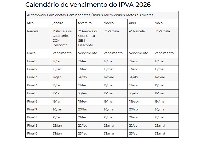 A partir da próxima segunda-feira (12) começa o prazo para os proprietários de veículos de São Paulo pagarem o IPVA (Imposto sobre a Propriedade de Veículos Automotores) de 2026. Motos de até 180 cilindradas estão isentas do pagamento.