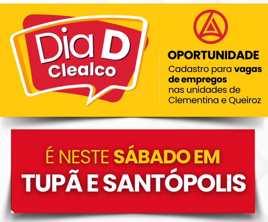 A Clealco, grupo paulista do setor sucroenergético com unidade em Clementina e Queiroz, realiza neste sábado (23), o “Dia D” para cadastrar interessados nas vagas abertas na área de Manutenção Automotiva. Ação acontece das 8h às 12h, nas cidades de Santópolis do Aguapeí e Tupã, e as vagas nas duas unidades da empresa são para contratação imediata.
