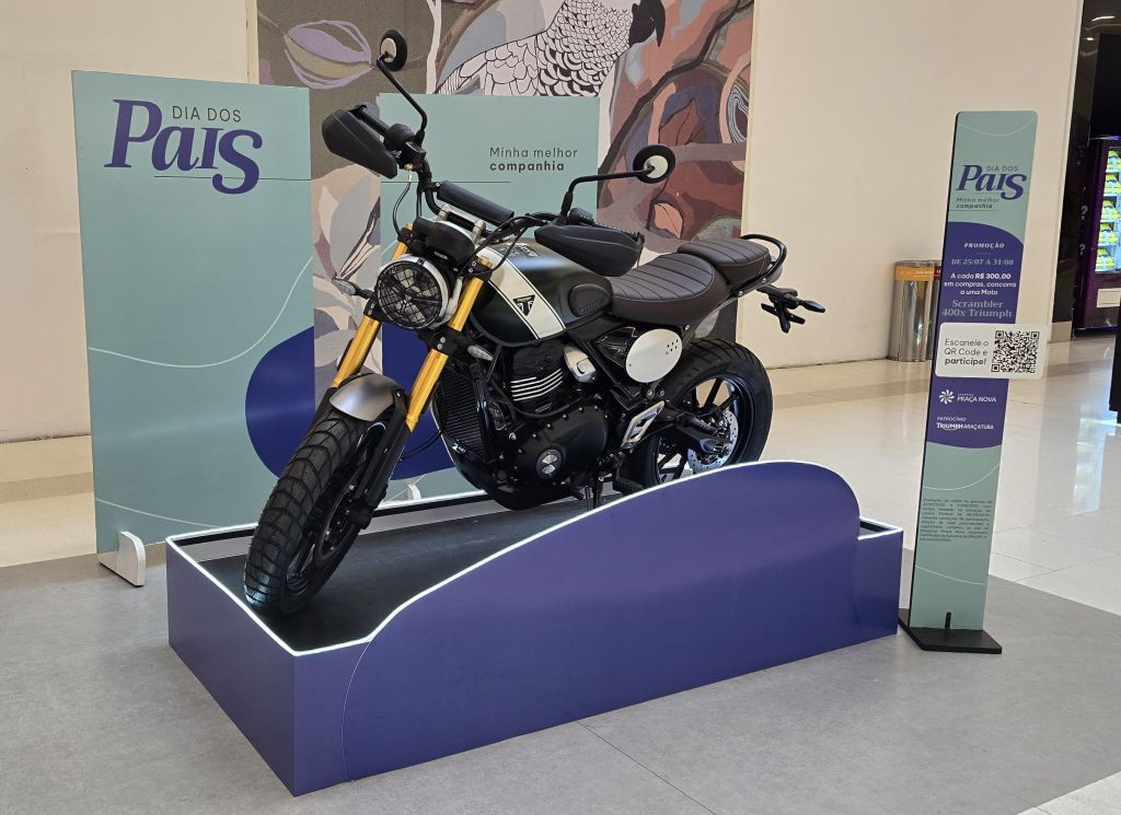 O Shopping Praça Nova Araçatuba (SP) irá sortear uma moto Triumph Scrambler 400X Matt Khaki Green, 0km, modelo 2025, para os clientes que fizeram as compras nas lojas participantes da campanha do Dia dos Pais, que vai até 31 de agosto.