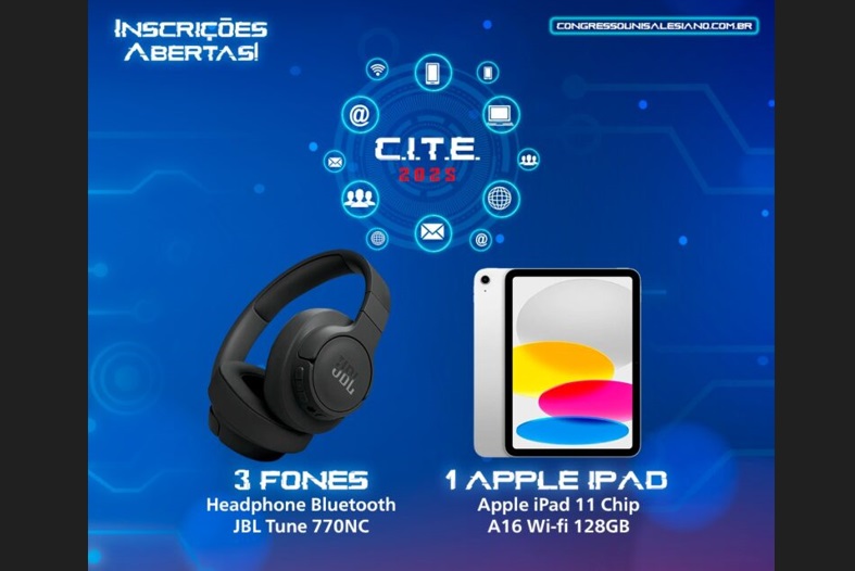 Quem se inscrever e confirmar o pagamento do certificado, concorrerá a prêmios exclusivos. Entre eles, estão três Headphones Bluetooth JBL Tune 770NC e um Apple iPad 11 Chip A16 Wi-fi 128GB.