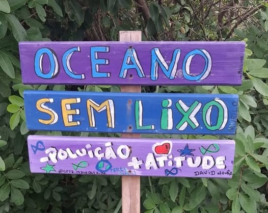 A praia é bem brava, ondas fortes, areias movediças. O grupo ficou na parte rural da praia. Essa placa fica no início de um trilha entre calçada e areia. Trata-se de um recado de uma ONG preocupada com a natureza.