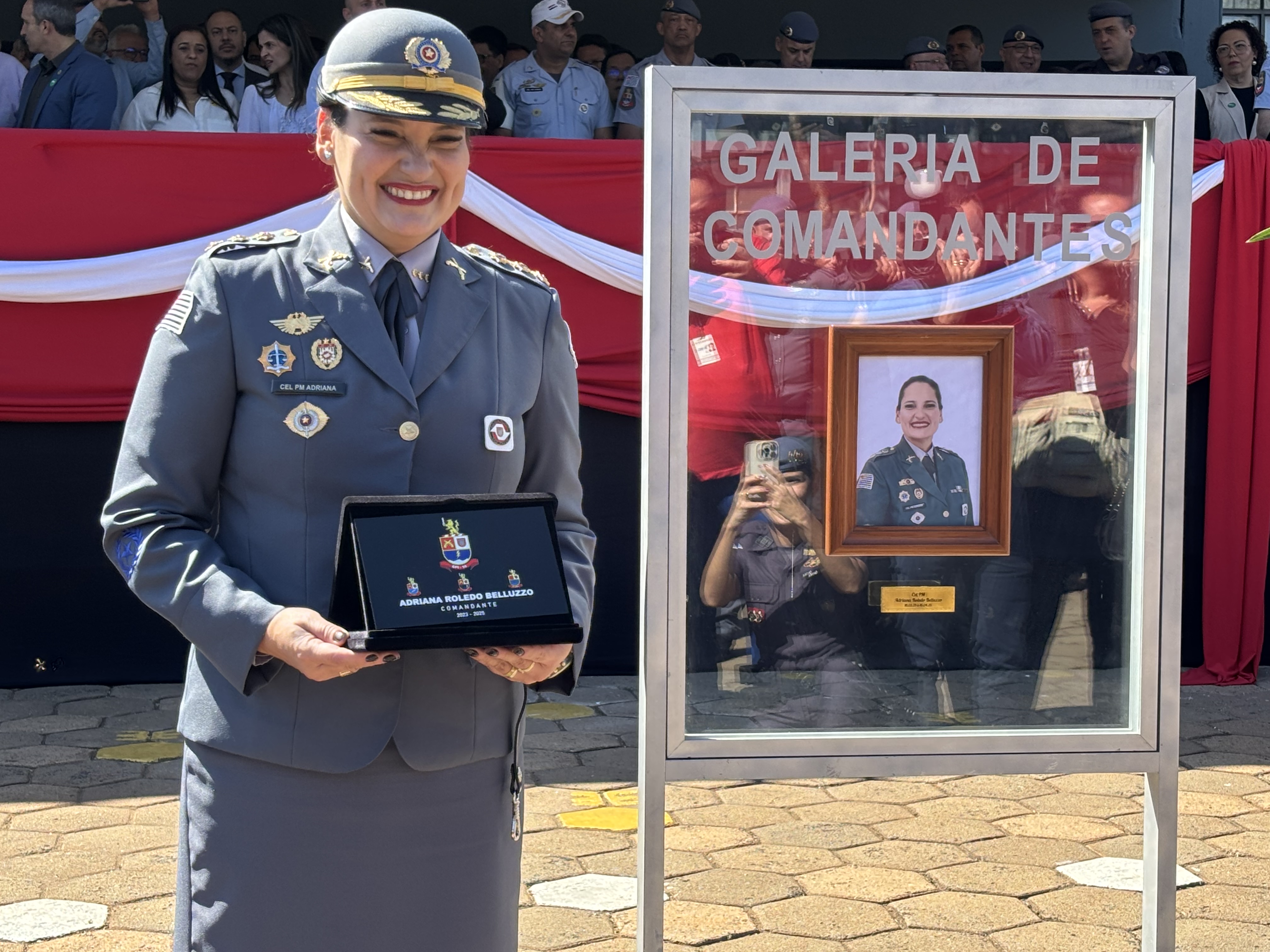 O evento também foi marcado por homenagens à coronel Adriana Belluzzo, que esteve acompanhada de familiares e ganhou flores e uma placa comemorativa.
