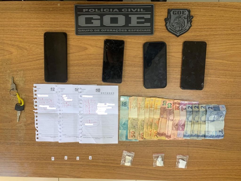 Como os números da placa coincidiam e a equipe já conhecia o condutor da moto, foi feita a abordagem. Durante as buscas, foram encontrados os quatro celulares, seis chips para celular, três porções de haxixe, também chamada de ICE, pouco mais de R$ 300,00 em dinheiro e anotações que seriam relacionadas ao tráfico de drogas.