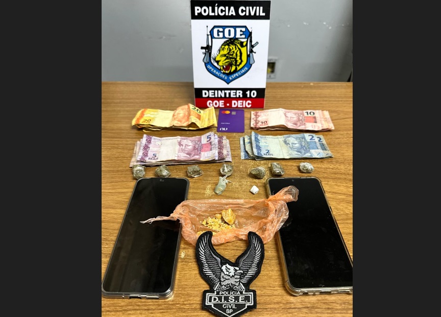 Também foram recolhidos R$ 253,00 em dinheiro, um cartão de crédito que teria sido deixado por um usuário, segundo o investigado, e dois celulares. O Canil do Baep (Batalhão de Ações Especiais de Polícia) prestou apoio com cão de faro.