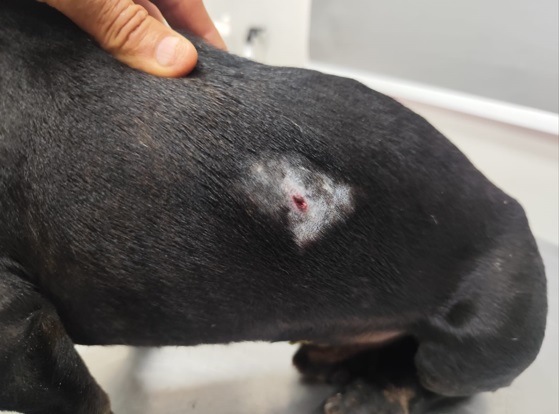 Segundo a polícia, o cão ferido foi socorrido com vida por um dos tutores e encaminhado para cuidados veterinários.