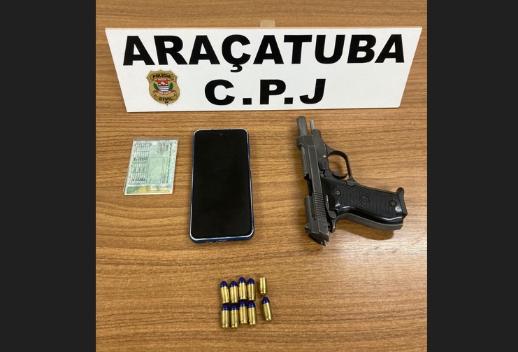 A Polícia Civil de Araçatuba (SP) prendeu na manhã desta quarta-feira (24), um homem de 39 anos, flagrado com um pistola. Ele já vinha sendo investigado, após denúncia em boletim de ocorrência, de que estaria fazendo ameaças, utilizando fotos de uma arma de fogo.