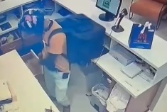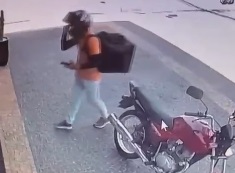Carregando uma sacola de entregador nas costas, ele estaciona na frente do estabelecimento e entra no prédio, ainda com o capacete na cabeça. Assim que entra na loja, o bandido saca a arma que carrega na cintura, anuncia o assalto aponta para três mulheres que estão no prédio e, de forma violenta, as empurra para o setor de estoque.
