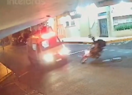 No cruzamento com a rua João Galo, que é preferencial, ele seguiu direto e bateu na moto da vítima, que cruzava a via. A colisão foi gravada por câmeras de segurança, que mostram que a ambulância estava com o giroflex ligado.