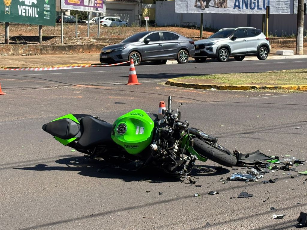 Um homem ficou ferido ao bater a moto de alta cilindrada que conduzia em um carro na manhã desta terça-feira (21), em um cruzamento da avenida Brasília, em Araçatuba (SP). Apesar da violência do impacto, ele foi socorrido consciente, segundo o que foi informado no local.