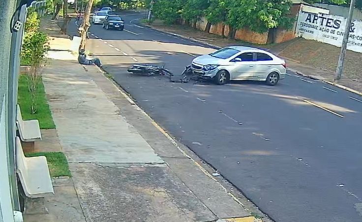 Nesse caso, a colisão também foi gravada por câmera de monitoramento do condomínio e mostra que a moto bate no parte da frente do carro, quando ele está atravessado no meio da via. O motociclista ainda tenta desviar para evitar a colisão, apesar de haver veículos se aproximando, trafegando no sentido contrário.