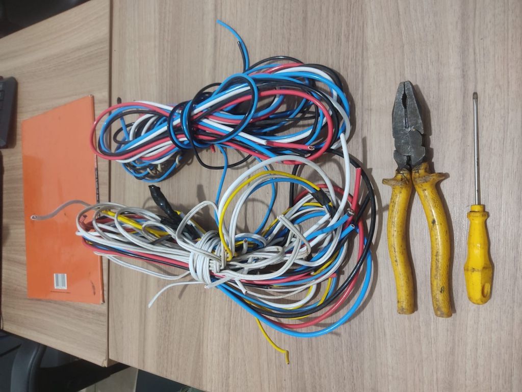 Ele foi levado ao local onde foi constatado que havia telhas removidas. Pelo buraco aberto na cobertura foi vista uma bolsa azul claro e nela havia cabos elétricos já retirados, um alicate e uma chave de fenda.
