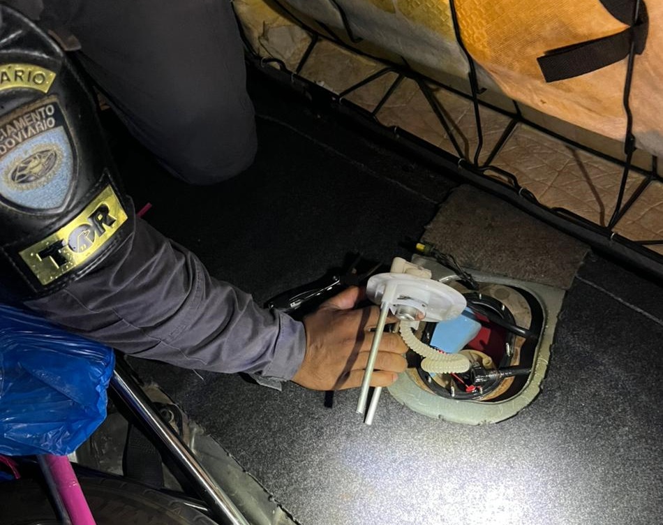 Durante minuciosa vistoria no veículo, os policiais localizaram dentro do tanque de combustível do automóvel, 50 pacotes de maconha, que somaram 5,125 quilos, e dez tijolos de cocaína, totalizando 10,480 quilos da droga.