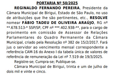 A Câmara de Birigui publicou nesta sexta-feira (1) no Diário Oficial do município, a nomeação de Fábio Tadeu de Oliveira Araújo, para o cargo de provimento em comissão de Assessor de Relações Parlamentares do Quadro Permanente da Câmara Municipal.