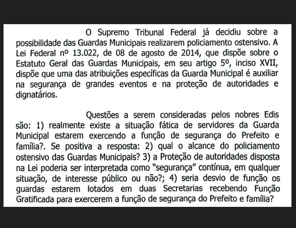 Ao emitir o parecer, o procurador Jurídico confirma que a Lei Federal 13.022, de 8 de agosto de 2014, que dispõe sobre o Estatuto Geral das Guardas Municipais, prevê que uma das atribuições específicas da Guarda Municipal é auxiliar na segurança de grandes eventos e na proteção de autoridades e dignatários, o que inclui prefeitos.
