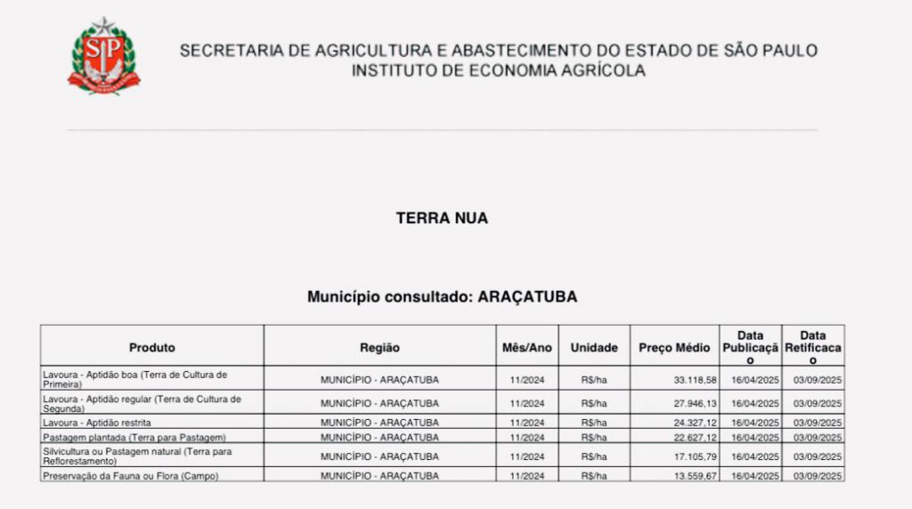 A nova tabela publicada pelo IEA (Instituto de Economia Agrícola) confirma os valores atualizados. Agora, cabe à Prefeitura de Araçatuba ratificar a revisão para evitar prejuízos aos produtores que devem entregar a declaração do ITR (Imposto Territorial Rural) ainda neste mês de setembro.