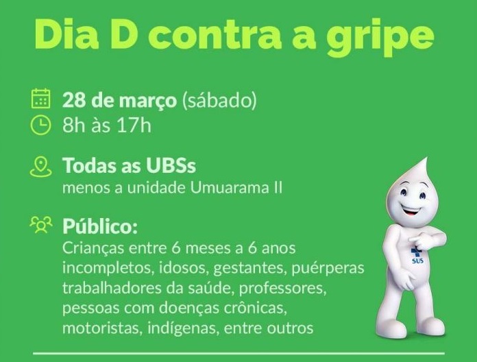 O imunizante será aplicado em todas as UBS a partir de segunda-feira (30), das 7h às 19h. Três unidades atendem até 22h: Morada dos Nobres, Planalto e Umuarama 2.