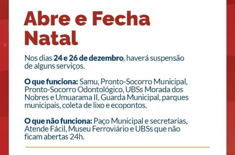 Com a decretação do ponto facultativo nos dias 24 e 26 de dezembro, o funcionamento dos serviços públicos municipais em Araçatuba (SP) sofrerá mudanças ao longo do período de Natal.