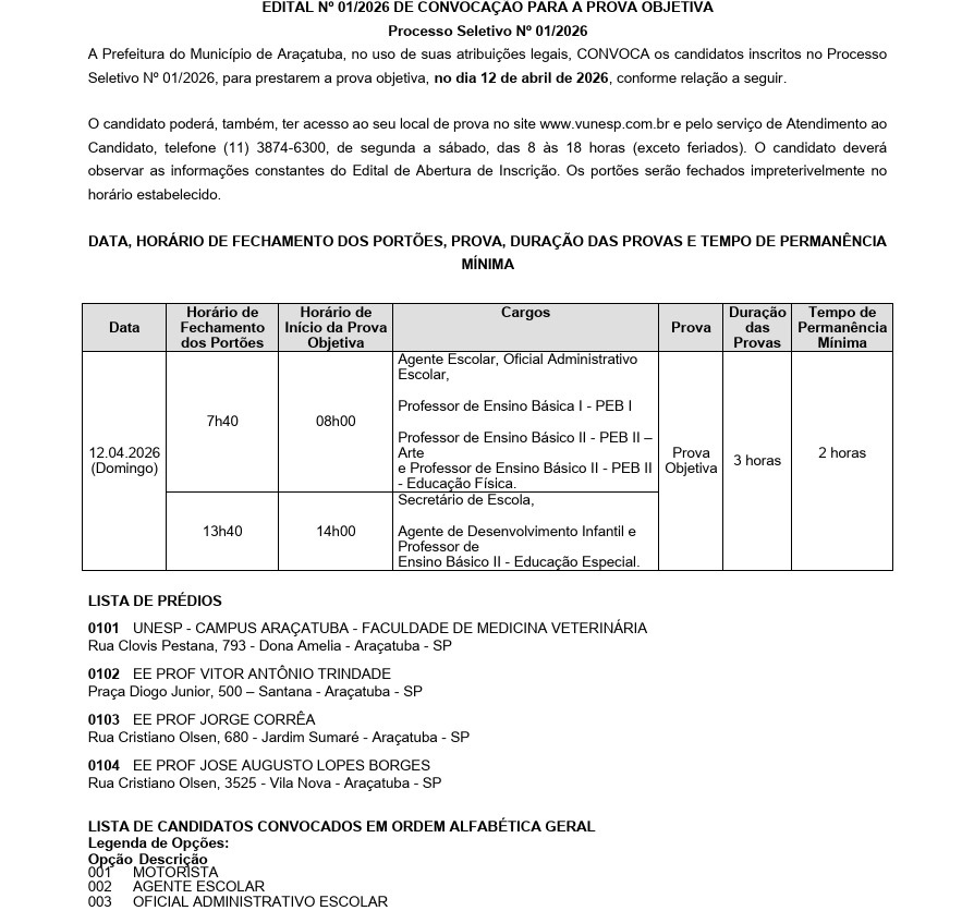 A Prefeitura de Araçatuba publicou nesta sexta-feira (6) o edital de convocação para a prova objetiva do Processo Seletivo nº 01/2026 da Secretaria Municipal de Educação. Os candidatos inscritos deverão realizar o exame no dia 12 de abril, um domingo.