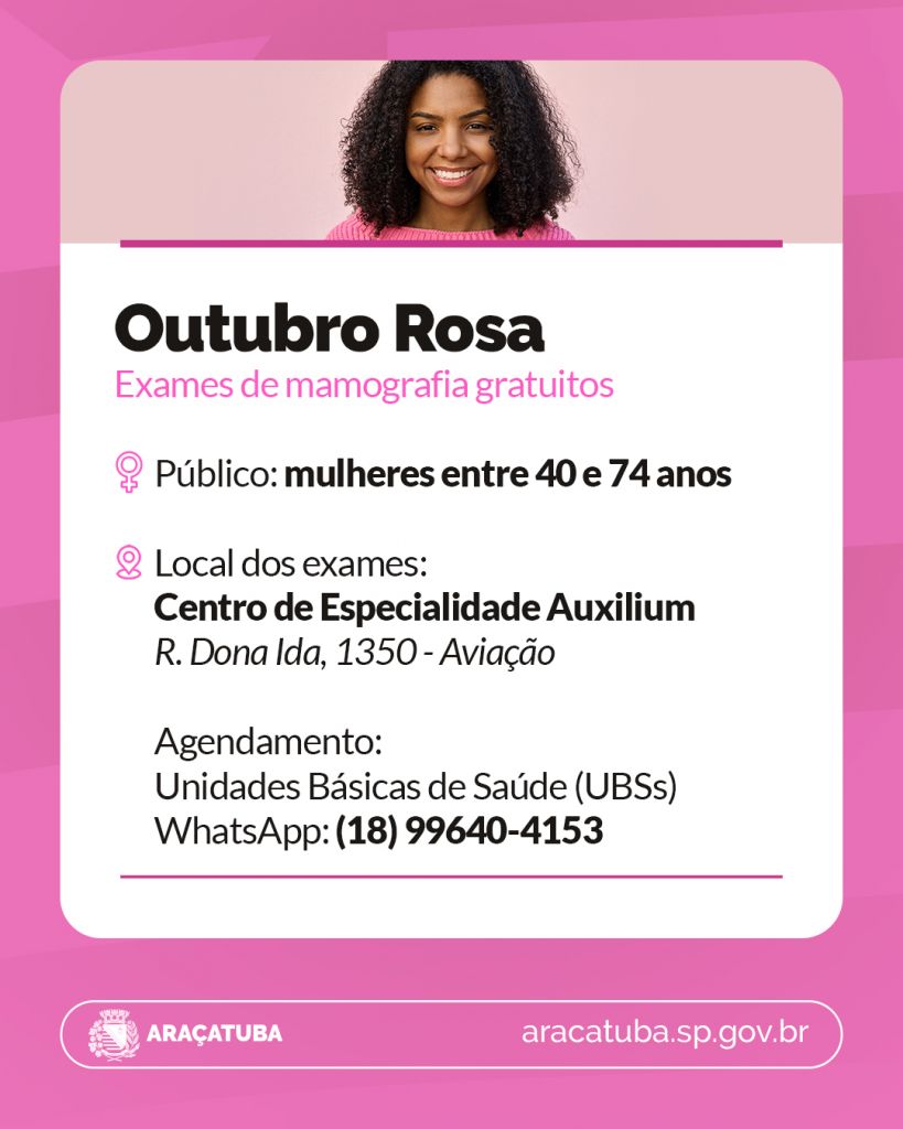 Durante a campanha, também estão sendo realizados exames de mamografia para mulheres de 40 a 74 anos que fizeram o procedimento há mais de um ano. As mamografias são feitas no Centro de Especialidades Auxilium, localizado na rua Dona Ida, nº 1.350, no bairro Aviação.